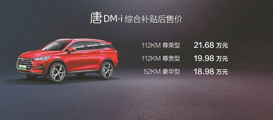 4月19日,比亚迪唐DM-i三款车型在上海车展宣布上市,享受综合补贴后,全国统一售价为18.98万元-21.68万元。 唐DM-i颠覆了传统混动技术以油为主的设计架构。此次上市发布的唐DM-i搭载了骁云-插混专用涡轮增压1.5Ti发动机、EHS电混系统、DM-i专用刀片电池等核心零部件,使唐DM-i百公里加速仅需8.5秒,纯电续航52KM版本的综合续航里程可达1010千米,112KM版本的综合续航里程可达1050千米,刷新了中国SUV能效标杆。 唐 DM-i传承了Dragon Face家族式设计语言,搭载DiLink 3.0智能网联系统与DiPilot智能驾驶辅助系统,人机交互打造智能空间。 当日,比亚迪还正式发布了e平台3.0,同时全球首发亮相了X DREAM、EA1两款全新设计理念车型。 据介绍,比亚迪专为下一代高性能智能电动车打造的e平台3.0,兼具智能、高效、安全、美学优势。它不仅将核心零部件进一步集成化、标准化,还构建了全新的车身结构、电子电气架构和车用操作系统BYD OS。比亚迪宣布e平台3.0将继续对行业开放共享。 (朱文庆)