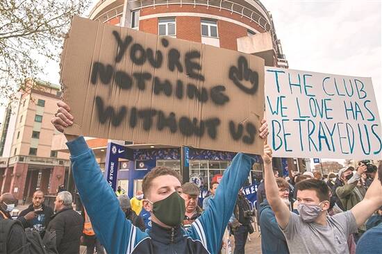 球迷举起标语,上面写着“没有球迷,你们什么都不是”、“我们爱的俱乐部背叛了我们” 图/视觉中国 |
