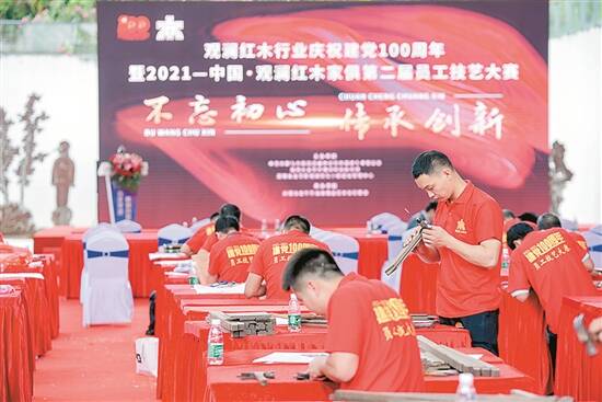 4月28日,中国·观澜红木家具第二届员工技艺大赛在中国版画博物馆开幕,来自全国的上百幅雕刻精品经过两天时间的多轮角逐,最终胜出者获得一二三等奖。 当天,中国木材与木制品流通协会红木流通专业委员会秘书长汪立禹、深圳市龙华区观澜街道办事处党工委副书记、办事处主任黄甲钊、深圳市龙华区观澜街道红木家具协会会长谷建芳等与各级相关协会、红木产业基地董事长、总经理、工艺大师和社会各界人士、媒体朋友近200人参加活动。 据相关负责人介绍,在庆祝中国共产党建党100周年之际,深圳观澜红木行业用百幅雕刻精品献礼,推出“百年荣光,雕刻历史”2021-中国·观澜红木设计雕刻大赛,旨在传承中国红木文化艺术,弘扬先烈们的拼搏精神,凸显观澜深厚的文化底蕴优势,以红木雕刻的形式具象体现建党百年的重要事件、重要人物、重要瞬间,并为观澜地区家具从业人员提供技能学习、展示、竞赛的舞台,促进行业人才培养,进一步提升观澜红木品牌影响力,帮助会员企业提高效益,促进行业和区域经济发展。 据了解,观澜红木产业已有40多年的发展历史,创新设计在行业领先,品牌、品质领先,是全国最早最大的红木艺术品生产基地及原材料交易展示基地之一,观澜红木企业拥有各种专利2000多项,获国家级奖项100多项。 据介绍,大赛于4月27日上午开始角逐,在比赛现场,数十款雕花工具依次排开,打毛胚、修光、刮花磨、打三角刀,每一道工序师傅们都细致入微,选手们各显神通,全情投入,凿木、刨木的声音响个不停。当天,数十名雕刻和木工选手经过紧张激烈的比拼,各奖项于28日下午全部揭晓。裁判组经过公平、公正、公开评选,共评选出一等奖2名,木工、雕刻各一名;二等奖4名,木工、雕刻各二名;三等奖6名,木工、雕刻各三名;优秀奖10名,木工、雕刻各五名。据悉,比赛结束后,组委会将精选100幅雕刻作品在龙华观澜各社区党群服务中心巡回展出。 (文/图 王志钰 杨凯瑞)