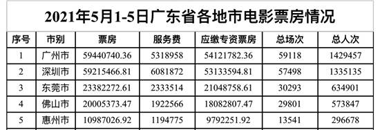 5月1日至5月5日,广东共放映电影场次25.26万,总观影人次602.46万,各项数据均领先全国。在广东省内,广州和深圳发挥了全国票仓城市的带头作用,贡献票房最多。其中广州贡献票房5944.07万元,放映场次59118,观影总人次142.95万,均排名省内第一。排名第二的深圳贡献票房5921.55万元,放映场次57498,观影总人次133.51万。广东省内五一档票房第三名和第四名的城市则是东莞和佛山。