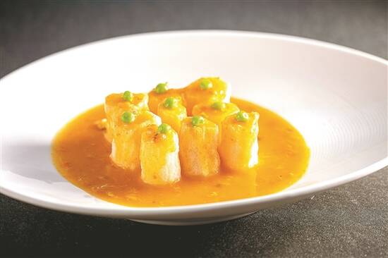 喜欢拍照发朋友圈的朋友就不要错过这道蟹粉百花酿云南竹笙,一听名字,就知道味道清爽淡雅而且颜值不低。餐厅大厨同样用酿的手法将虾胶酿进竹笙,白里透红的鲜虾在“朦胧”的竹笙包裹下,加上金黄色的蟹粉酱汁,色彩清新亮丽,让人食指大动。