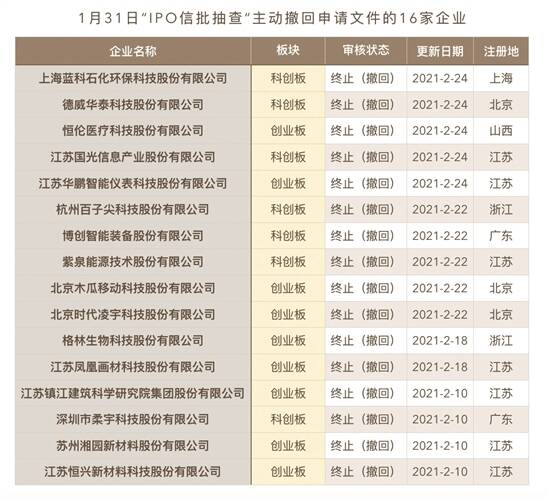 今年1月31日,证监会发行监管部发布了“首发企业信息披露质量抽查抽签结果”,共20家企业中签(创业板11家、科创板9家),在抽签结果公布后的24天内,共计16家中签企业主动撤回了申请文件。