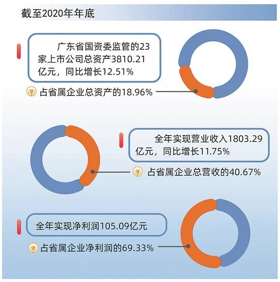 文/羊城晚报记者 黄婷 制图/黄国栋 近日,广东省国资委和下属中金岭南、粤水电、风华高科、宏大爆破四家上市公司亮相深交所上市大厅,举行广东省属国有上市公司2020年度暨2021年一季度集体业绩说明会。数据显示,广东省国资委监管的23家上市公司2020年实现营业收入1803.29亿元,同比增长11.75%,占省属企业总营收的40.67%;实现净利润105.09亿元,占省属企业净利润的69.33%。 10家资产逾百亿5家市值过200亿 羊城晚报记者梳理发现,广东省国资委监管的23家上市公司有4家属于金属与采矿行业,居各行业之首;广州是广东省属国有上市公司最为集中的城市,共有7家;各省属企业集团拥有的上市企业数多寡不均,广晟控股集团(6家)、粤海控股集团(5家)和广新控股集团(4家)数量领先,拥有上市平台的省属企业集团共有10家。 从资产规模来看,有10家上市公司的总资产超过100亿元,粤电力A、粤海投资是省属国有上市公司总资产的“第一梯队”,明显高于其他公司。从总市值来看,以今年3月31日收盘价计算,总市值高于200亿元的有5家,分别为粤海投资、白云机场、风华高科、宏大爆破、粤电力A,总市值高于100亿元的总计8家。 据了解,2020年7月,广东省委深改委印发《关于深化省属国资国企改革发展的若干措施》,提出将制定并实施省属企业资本运营三年行动计划,推动国有资产向上市公司集中。2022年实现1至2家省属企业集团整体上市,力争每家省属企业至少有1家主业上市公司。 广东省社会科学院国有资产监督管理研究中心主任梁军在接受羊城晚报记者采访时表示,证券市场有一套侧重市场化、法制化的上市公司监管与评价体系,更加公开透明,更加能发挥市场资源配置的决定性作用。广东国资国企加大资本证券化力度,包括推动集团公司整体上市,有利于检验国企改革的成效,也有利于更好发挥国企的控制力和影响力,既是“双保险”,也是“试金石”。 粤开证券研究院副院长康崇利也对羊城晚报记者表示,对企业而言,推动国有资产向上市公司集中,能够支持企业做强做大主业上市平台,打造一批具有核心竞争力的龙头上市公司;对监管而言,推动核心企业上市,国有资本能够以股东身份和市场化方式监管运营。 哪几家公司去年最能“赚”? 数据显示,2020年,面对新冠疫情的冲击,广东省属国有上市公司经济效益实现逆势增长。一方面,过半省属国有上市公司全年的营业收入较去年有所上涨。中金岭南和粤电力A的营业收入位居23家公司的前两位,分别为302.26亿元和283.29亿元;从增长率看,广晟有色、粤海置地去年的营业收入实现翻番,同比增长125.89%和117.80%;中金岭南、风华高科、省广集团、粤水电、佛山照明营收也实现两位数增长。 另一方面,大多数省属国有上市公司均实现全年归母净利润为正。粤海投资(37.84亿元)、粤电力A(17.46亿元)和粤海置地(14.11亿元)成为最能“赚钱”的省属国有上市公司;归母净利润增幅最大的是广东鸿图(4.65%)和粤海置地(3.62%)。 高质量的业绩增长,离不开各大国有上市公司聚焦主业、扎实经营的一系列举措。在业绩说明会上,广东省国资委主任、党委书记李成表示,省国资委加强省属企业资源整合,明确省属企业功能定位,加快集团非主业、非优势业务剥离。 以去年营业收入位于23家省属国有上市公司之首的中金岭南为例,其主业是铅锌铜等有色金属的采矿、选矿、冶炼和深加工一体化生产。2020年,公司通过公开发行可转债可转换公司债券,募集38亿元,主要用于部分采选工程项目和绿色化升级改造项目等。 未来五年研发投入将年均增15% 在梁军看来,聚焦主业是发挥国有经济的竞争力、创新力、控制力、影响力和抗风险能力,“创建世界一流企业”新发展目标的内在要求。国有控股上市公司应在聚焦主业方面发挥好带头作用,做中国境内上市公司高质量发展的主力军和“压舱石”。 从年报看,不少广东省属国有上市公司围绕主业加大研发投入,加快科技成果应用。2020年,宏大爆破共获得发明专利9个、实用新型专利38个;民爆板块持续推进智能制造,以生产线自动化、生产线减员为技术更新方向,降本增效,确保生产本质安全;防务装备板块围绕转型升级任务进行科技创新,推进传统向高端的转型升级,以及生产制造由手工、半自动向全自动化、信息化、智能化的转型升级。 值得关注的是,目前广东国资系统正开启贯彻落实全省科技创新大会精神,未来五年广东省属国企研发投入将年均增长15%。广晟集团在省属企业中率先实施科技攻关“揭榜挂帅”行动,在矿业和电子信息两大主业向全球公开张榜招贤,首批两个“揭榜挂帅”项目引来两名院士揭榜。其相关负责人透露,力争到“十四五”末,该集团产业机构明显优化,80%的资源集中到战略性支柱和战略性新兴产业,打造世界500强企业。 部分公司加快剥离非主业步伐 除了加大科研创新力度,一些省属国有上市公司也在加快剥离非主业、非优势业务的步伐。记者留意到,风华高科近日发布公告称,将通过公开挂牌的方式,引入战略投资者对奈电科技实施增资扩股,增资完成后,公司持有奈电科技的股权比例将由100%变更为30%,新引入战略投资者持股70%,奈电科技将不再纳入公司合并报表范围。 根据该公告,奈电科技主营产品虽然同属于电子元件行业,但差异较大,难以与公司主业产生协同效应。基于聚焦主业发展战略