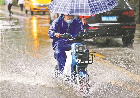 市民骑车经过积水点 羊城晚报记者 王磊 摄 |