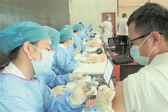 羊城晚报讯 记者钱瑜、通讯员任平摄影报道:5月27日,中建三局一公司横琴科学城项目党支部联合珠海市人民医院医疗集团横琴医院开展了“我为群众办实事”系列活动之第二次“疫苗接种进工地”疫苗接种。截至目前,中建三局一公司横琴科学城一期、二期项目和横琴新区市民服务中心项目全体在岗管理人员及20余家劳务、专业单位工友共计2000人次,已全部完成第二次新冠疫苗接种,疫苗接种率达到95%以上。 “接种疫苗后3天内,请不要饮酒,不要吃辛辣刺激食物,注意休息,请在旁边留观30分钟确认无异常后再离开……”在横琴科学城一期项目报告厅内,珠海市人民医院医疗集团横琴医院的医生正在为刚刚完成第二批疫苗接种的群众讲解注意事项。接种流动点现场,在珠海市人民医院横琴医院志愿者和中建三局一公司横琴科学城一期项目全体工作人员的配合下,接种人员逐一排队、秩序井然。现场共设置了测温登记点、预检分诊区、等候区、接种区、留观区、异常反应处置区等区域,实行分流接种,避免了人员聚集。 中建三局一公司华南公司相关负责人称,中建三局横琴科学城一期、二期项目和横琴新区市民服务中心项目将继续做好疫情常态化防控要求,加强全体人员防护,做好防疫措施,尽快完成剩下少数职工的疫苗接种。