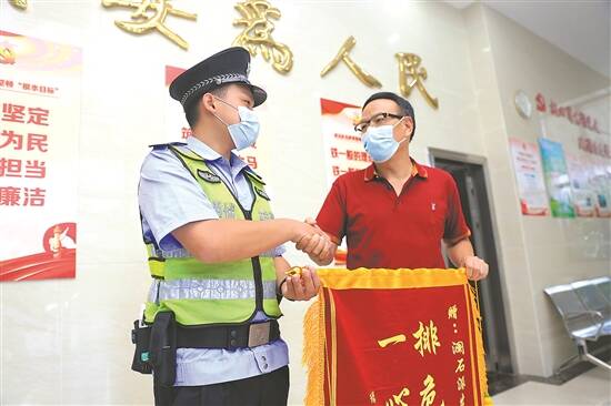 吴先生专程来到澜石派出所,向辅警刘海龙献上致谢锦旗 |