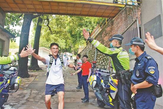 考生与民警击掌庆祝高考结束 |