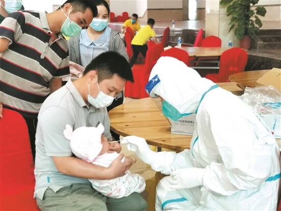 南庄镇溶洲村,詹昭坤正在帮一名婴儿做核酸采样 图/受访者提供 |