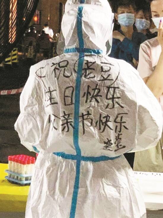文/图 羊城晚报记者 王俊 通讯员 马晓群 6月20 日是父亲节,也是广州中医药大学深圳医院病理科护士李莹莹父亲的生日。这一天,奋战在核酸检测抗疫一线的她无法陪伴在父亲身边,她选择用一种独特的方式来表达自己对父亲的爱。 李莹莹别出心裁地用采样试管拼出了“爱心”形状,并在防护服上写下了“祝老豆生日快乐,父亲节快乐!”的祝福语,以这种特殊的方式为父亲送上礼物。 同事们在得知此事后,也都非常感动,并决定一起通过视频向“李爸爸”送出生日祝福。 与此同时,医护人员们在采样工作群中,向该院所有在父亲节当天仍奋战在抗疫一线的“医护老爸们”送上诚挚的节日祝福。