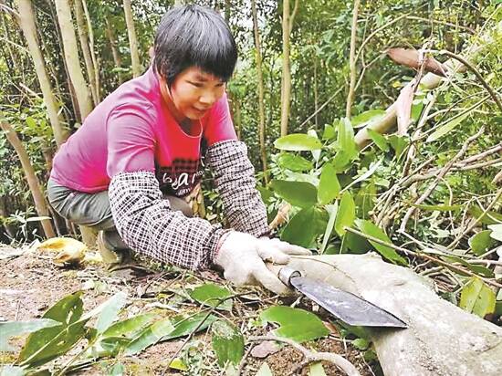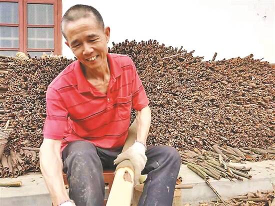 “我1984年开始种桂,现在种了超过30亩,今年收入起码超过5万元。”旺洞村的村民冯天元一边挥舞着割刀采剥桂皮一边说。之后他把剥好的一块块桂皮铺晒在自家楼顶、晒场上,屋里屋外形成了一道独特的风景。