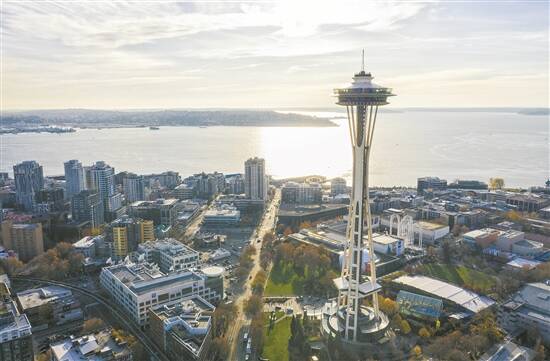 西雅图地处美国西北,地势高。太空针塔,位于西雅图市中心,离唐人街不远,为本地地标性建筑。1962年西雅图将要举办世界博览会,1961年始特意修筑此塔,塔高184米,建成时是美国西部最高的建筑物之一。塔最宽处有42米,总重9550吨,能抵御9.1级地震或每小时10公里的风力。在世博会期间,先后接待230万客人登塔观光。太空针塔在游人心目中的分量可见一斑。