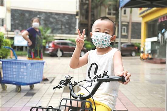 解封后小区一名小朋友对着镜头比出胜利手势 |