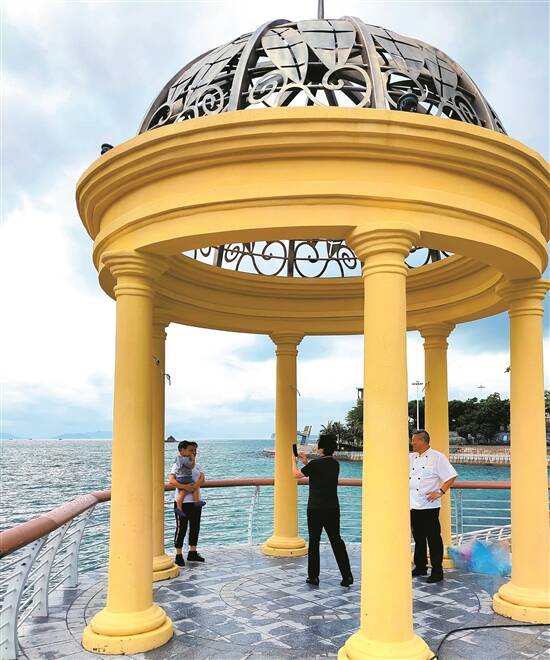 视野开阔的海滨步道;极具滨海特色的中东海枣树随风摇曳;充满滨海风情的镂空式观赏亭可拍无敌海景。近日,市民发现大鹏新区南澳海港路人行道蜕变成一处极好的滨海风情打卡地。 据悉,日前,海港路景观提升工程顺利验收,沿路景观焕然一新。如今,走入海港路,映入眼帘的是视野开阔的海滨步道,亲近大海的白色护栏美观大方,极具滨海特色的中东海枣树分布有序,脚下是波浪形铺装的灰白渐变花岗岩,不远处还有充满滨海风情的镂空式观赏亭,观赏台设置有夜景灯光。海滨步道还新增了下行楼梯,经月亮湾畔观海栈道直通月亮湾广场,7公里“最美落日栈道”连通性大大提升。“以前,因为绿化带遮挡了,吃饭的游客看海景只能上二楼,现在海港路这一提升,一楼也能欣赏无敌海景。改造完成后,感觉海港路的档次和品质都有了很大的提升,让我们生意变得更好了!”在海港路经营海鲜餐饮场所的钟先生表示。游客居民在海港路酒家享用美食的同时,可透过落地窗尽享月亮湾美景。 据了解,海港路景观提升工程位于南澳中心城区,是“最美落日栈道”重要节点,占地约3100平方米,是南澳今年的重点改造提升项目之一。经过仔细研究、多次改进设计和工艺,并克服疫情影响,该项目于日前顺利完工。下一步,南澳将继续从最贴近游客和居民需求出发,融合国际和本地文化元素,聚焦世界级滨海生态旅游度假区核心区建设,以“花漾边坡”“口袋公园”“网红打卡地”等建设和提升为抓手,加快营造“一步一景”全域旅游南澳风情。(文/图 蒋佳元 黄建平 徐伟婷)