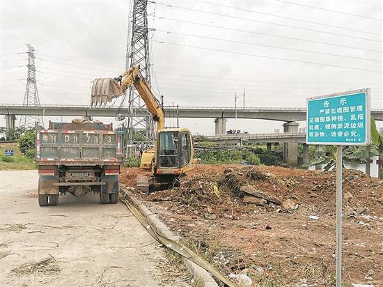 西南涌旁,工作人员正在使用钩机清理垃圾 |
