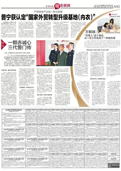 羊城晚报讯 记者赵映光、通讯员普新办报道:记者7日从揭阳普宁市获悉,在国家商务部7月4日公布的新认定105个国家外贸转型升级基地名单中,广东省普宁市国家外贸转型升级基地(内衣)榜上有名,这也是此次