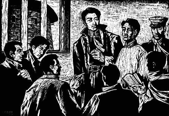 《1927毛泽覃在饶北》版画 陈骏 画 |