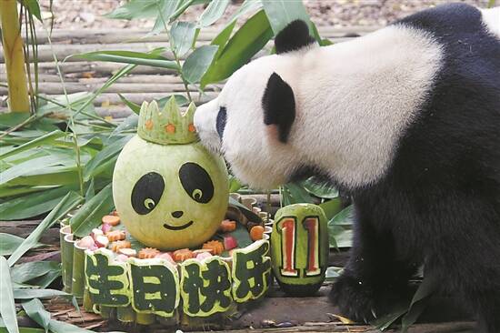 羊城晚报讯 记者王俊、通讯员李木生摄影报道:8月15日,大熊猫“园舟”在深圳野生动物园迎来了11周岁生日。该园制作了精美“水果蛋糕”,为大熊猫“园舟”举办了别开生面的生日会。 当天上午,深圳野生动物园熊猫庄园生日会现场,动物园工作人员为大熊猫“园舟”准备了专属“水果蛋糕”。蛋糕外皮采用新鲜竹子、西瓜拼成,整只西瓜外皮雕刻卡通大熊猫图案格外醒目,中间填满了“园舟”爱吃的食物,顶层用水果制作了“生日帽”,烘托生日气氛。整个“蛋糕”绿色环保,寓意祝愿“园舟”在深圳健康生活。 据了解,大熊猫“园舟”为雄性,2010年8月15日出生于成都大熊猫繁育研究基地,2013年2月6日来到深圳野生动物园生活至今。