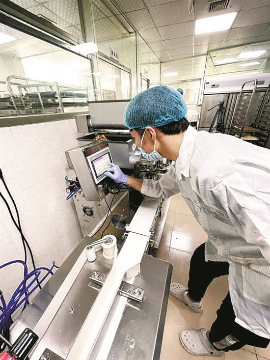 羊城晚报讯 记者谢颖、通讯员邹俊圣摄影报道:东莞樟木头“观音绿”荔枝远近闻名,眼看着中秋节将近,樟木头镇金河社区一企业近期推出“观音绿”月饼,这也是“观音绿”荔枝深加工产业链的又一次延伸。 在“观音绿”荔枝的主产区——樟木头金河社区,一家名为壹浩农业的公司生产部车间内一片忙碌的情景:切馅、称量、烘干、和料、压形、烘烤……经过一系列步骤的制作,一个个金黄皮薄、体型饱满的“观音绿”荔枝月饼就这样从机器的传送带上新鲜出炉。 “这是一条创新的道路。其他水果可以走‘深加工’的发展道路,为什么‘观音绿’荔枝不行呢?”壹浩农业总经理蔡建权介绍道,企业积极响应市、镇大力推动乡村振兴举措,助力发展“一村一品、一镇一业”,做强富民兴村荔枝产业,要想让具有樟木头特色的“观音绿”荔枝走得更远、发展得更好,唯一的出路就是要在创新发展上花心思、下功夫。 蔡建权说,经过政府和社会的大力推动,“观音绿”荔枝在水果市场上已有一定的地位,但还远远不够,因时间和保鲜方面的局限,荔枝的采摘和售卖周期短极大地影响了产业的发展。于是,该公司创新思路,把荔枝进行“深加工”,结合中秋佳节,推出了荔枝月饼。 蔡建权介绍称,公司从去年开始研制“观音绿”荔枝月饼,过程中遇到了不少困难,因为荔枝果干糖分较高,单一地只加入果干让月饼太甜而腻口。但经过多次的尝试,在馅料中按照一定的比例加入榄仁干、脱皮核桃肉等坚果,降低馅料的甜度,中和月饼的味道,使最终成品的月饼达到软糯、浓香、微甜的口感。