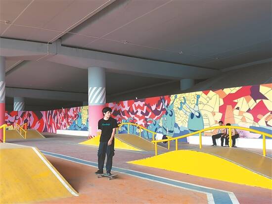 佛山桥底空间利用较好,澜石大桥下改造的滑板广场引来青少年练习 |
