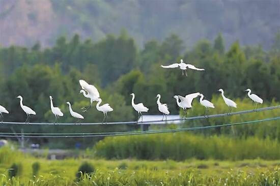 最近,一群“小可爱”经常出现在珠海市斗门区南澳村的田间地头。雪白的蓑毛、机敏的眼神、又长又尖的嘴巴、修长纤细的颈脖,还有一对细细的长腿……它们就是白鹭。喜欢观鸟的市民和游客有福气了,可以前往南澳村近距离打卡。 据了解,白鹭,别名鹭鸶,俗称白鹤,属于《濒危野生动植物种国际贸易公约》名单上的物种,国家二级保护动物。它们多栖息于沿海岛屿、海滩、河口、湖泊、水稻田和沼泽地带。或呆萌、或优雅的白鹭,惹来不少摄影爱好者架起长枪短炮,只为拍摄和欣赏它们往来翻飞、悠闲自适的舞姿。 绿油油的水田随风拂动,翩翩白衣,悄落田间,白鹭在秧苗地停歇着。雪白的蓑毛在阳光下熠熠生辉,灵动可爱。它们时而在水田里觅食,时而在田埂上嬉戏,时而向着天空翩翩而舞,忽而又旋回飞向水面。它们也爱凑热闹,熙熙攘攘地挤在电线杆上,乡间田野也多了几分诗意与生机。 白鹭飞翔时,头往回收缩,颈向下曲,两脚向后伸直,两个宽大的翅膀缓慢地鼓动着,动作从容不迫,姿态优雅。捕食时,它轻轻地涉水向前,眼睛死死地盯住水里活动的小动物,突然长嘴向水中猛地一啄,食物便到了嘴里。 据悉,白鹭是大自然的“环境监测专家”,成群的白鹭在南澳村出现,足见这里的生态环境优越。洁白的身段与碧绿的农田相映成趣,仿若一幅充满野趣的乡村田园生态画卷。不过,想到南澳村观鸟的朋友要注意了,尽量选择与自然环境颜色近似的衣服,以及观鸟过程中要注意不要高声叫喊,保持适当的观鸟距离,严禁投喂食物或者投掷石块惊吓驱赶鸟群。 (梅尔)