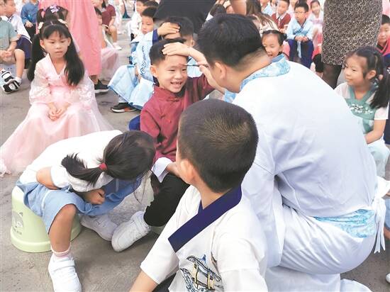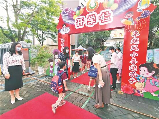 文/图 羊城晚报记者 郑达 杨楚滢 9月1日,“神兽”归笼。当天,珠海全市中小学、幼儿园共有40多万学生返校(园),开启新学年。 当天早上7时,珠海不少学校门口已经聚集了不少人,送孩子的家长、接孩子的老师、一脸懵的孩子让安静了许久的学校热闹起来。 记者留意到,开学首日,学生和家长都比较开心,哭闹的孩子或舍不得孩子的家长寥寥无几。“开学了,我们都很兴奋,孩子也很怀念校园生活。”香洲区凤凰小学一位二年级学生家长感慨。 老生送新生进班级 9月1日上午7时许,香洲区凤凰小学五、六年级的同学排着队在“开学门”后迎接一年级新同学,充当引导者。“大手拉小手”,把新生送到班级中。据悉,该校今年共招收249名新生,分为5个班级。 “新生刚来到学校会紧张,有年纪相近的小朋友带着他们就会好一些。很多老生都愿意做引导者,不少老生往返跑了好几趟。”该校六年级级长胡玉珍告诉记者,“一方面让新生有归属感,另一方面,有了同龄人的带领,新生可以迅速适应。” 同样开展“传帮带”的还有珠海市共乐幼儿园。为了尽快让孩子们适应学校环境,共乐幼儿园早在8月28日-29日开展了新生入园仪式,家长和孩子一起做亲子适应活动。开学后,还有“传帮带”活动。园长陈晓涛介绍:“我们有‘大带小’的传统,每一层都安排了小班、中班、大班。哥哥姐姐们会特别照顾、呵护弟弟妹妹,小班的孩子也就能很快融入幼儿园的生活。” 50余门特色课程可供选择 香洲区凤凰小学校长严文桂一大早就在学校门口迎接学生们到来。除了迎接新生,他还有不少工作要做。“我们小学周围有好几所学校,平时每到上下学时间,就堵得厉害。”严文桂说,“通过与交警部门协调,学校门口的道路在每天7时至8时30分,就会成为单行道,还会有交警维持秩序。”记者在现场看到,虽然校门口车辆密集,但道路一直保持通畅。 此外,疫情防控工作也不容忽视。严文桂介绍,该校开展了全校的消杀工作,“厨房、教室、桌椅等都进行大消杀。”学校也会对学生进行健康调查,结果会反馈给班主任。 9月1日是教育部发布“双减”政策后新学期的第一天。严文桂介绍,该校一二年级将不布置作业,高年级学生的作业量也在一小时内可以完成。“每个教室都有一张老师的办公桌,老师们只要有时间就会在那里批改作业,一方面能够减轻孩子的负担,另一方面,发现问题也可以及时跟孩子当面交流。” 此外,该校还开展“5+2”政策,即5天开放课后托管,每天两节特色课程服务,“我们学校已经开展54门特色课程,包含音乐、美术、科技等,已有1600人次报名。未来还要继续开放新课程。”严文桂说,“所有的课程均由珠海市妇女儿童中心组织授课,校内老师不能参与。” “国风”开笔礼为孩子启蒙 除了几位舍不得和爸爸妈妈告别的一年级新生外,凤凰小学大部分同学都对开学表现得相当兴奋。 “兴奋了一晚上,昨晚我都没睡着。”五年级的代瀚菲同学说,“我对开学非常期待。”另一位同学高琳萍则表示很开心能够回校见到同学。 当日,凤凰小学还组织了一场“国风”开笔礼,通过正衣冠、行拜师礼、朱砂开智、击鼓明志、启蒙描红等环节,让249名一年级新生接受“礼”的熏陶,开启智慧之门。 记者在现场看到,不少新生穿着汉服来参加当日的开笔礼,而一年级的老师们也穿上了统一的汉服。在老师的指导下,新生们互相整理衣领、衣襟,寓意“先正衣冠,后明事理”。额头上点一抹“朱砂”则意为开启智慧,从此眼明心亮。一撇一捺写“人”字,为孩子们上了一堂生动的启蒙课。