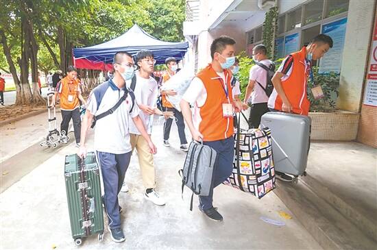 羊城晚报讯 记者陈卓栋,实习生马千淳,通讯员江宣、江逸轩、谭耀广摄影报道:记者7日从五邑大学获悉,日前五邑大学迎来了新生开学日,共有5000余名新生前来报到,目前已顺利入学。 据介绍,今年五邑大学面向全国24个省区市和港澳台地区招生,共录取新生5232名,包含902名专升本新生、4330名普高新生。 五邑大学相关负责人介绍,为确保新生能安全、顺利到校,学校在江门汽车总站、城轨江门站、江门东站、新会站等设立了五邑大学新生接待点,并在每个站点都设置了疫情防控点,备有测温枪、口罩、洗手液等,同时宿舍内也放置了防疫物资,为新生的健康保驾护航。 考虑到家长不能陪同进入校园,新生入校后,学校专门安排了接驳车将学生从校门口送达宿舍楼下,让远道而来的同学们不必为搬运行李而烦恼。另外特别安排了“一对一”新生接待服务,新生从到达车站开始,到测温扫码进校、办理报到手续以及入住宿舍,全程都有“一对一”志愿者提供周到服务。 同时,为有效避免人群聚集,学校设置了北主楼一楼大厅、学生综合服务中心两个报到点,并安排超过6000名志愿者参与迎新工作。