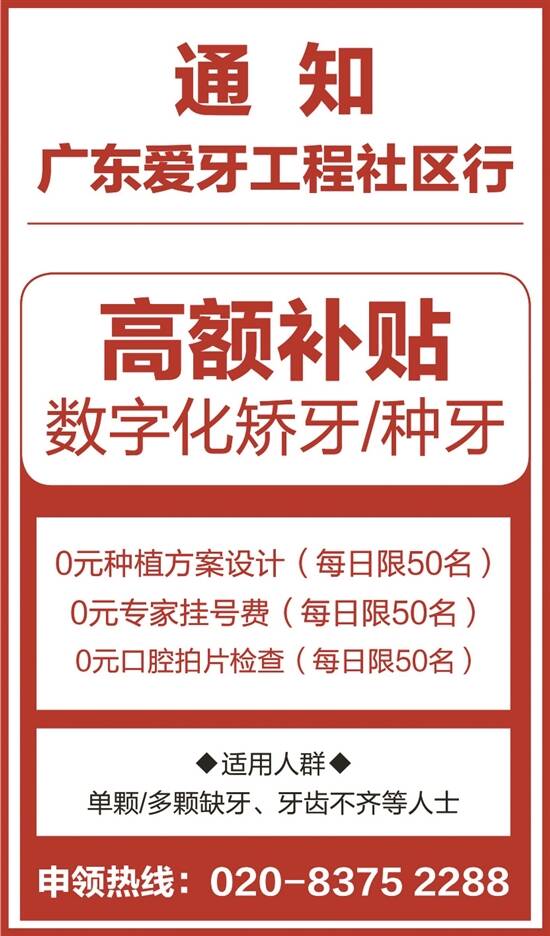 “广东爱牙工程社区行”派福利!致电020-8375 2288即可申请种植牙高额补贴,电话报名即可免挂号费、专家会诊费、数字化种植方案设计费。
