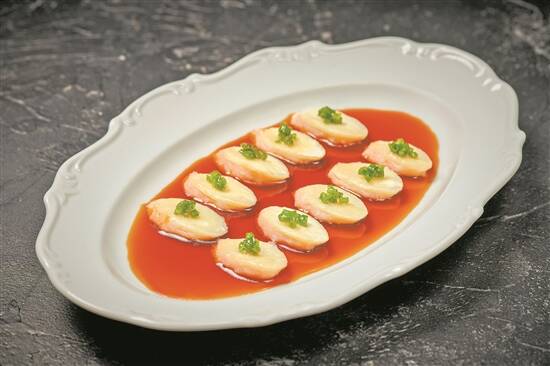在水质纯净海域的自然繁殖,造就了肉质细嫩柔滑、自然鲜甜的水晶蟹,其韧性具有十分独有的风味。而鸡油的香浓与花雕酒的醇厚,可为水晶蟹增添别样的香气,空中一号餐厅这道花雕蛋白蒸水晶蟹味道清鲜,细腻温润。
