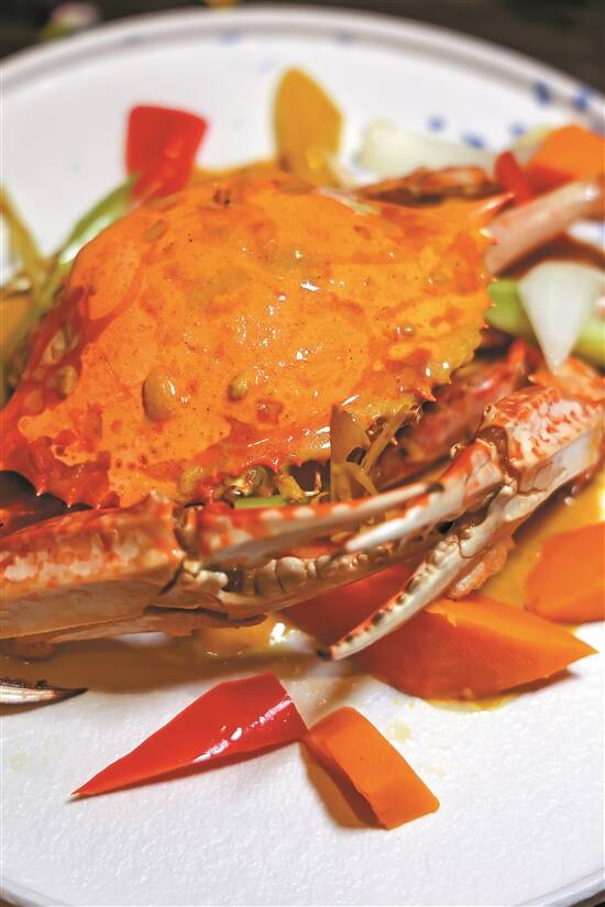 入秋肯定少不了螃蟹的身影,烹制手法也多种多样,长隆酒店白虎自助餐厅大厨选用个头肥大壮实、肉质嫩滑的新西兰塔斯曼青蟹,烹制出一道具有东南亚风味的咖喱南瓜青蟹。青蟹过油锁住蟹肉水分,然后放入咖喱炖煮,让浓郁的咖喱与蟹肉充分融合。