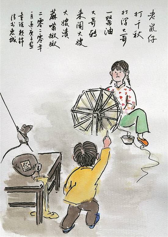 惠州话民歌中有许多童谣和游戏歌,图为童谣《老鼠仔打秋千》 赖锦清 画 |