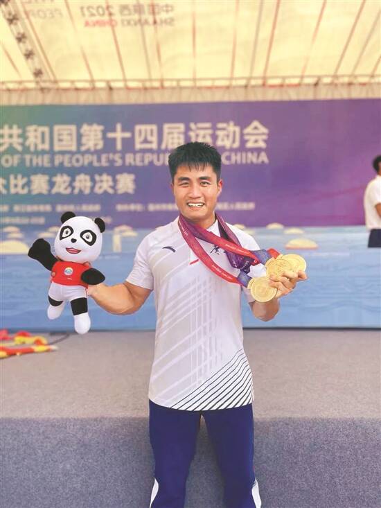 文/图 羊城晚报记者 余宝珠 通讯员 邱发平 9月22日—24日,在第十四届全运会群众比赛龙舟决赛男子组100米、200米及混合组100米直道三项决赛中,来自中堂的运动员万桂成(东莞唯一一名男子参赛选手)作为广东龙舟队的一员参加比赛,凭借和队友默契配合,奋力拼搏,成功斩获3枚金牌。记者10月14日获悉,万桂成于近日回到了家乡。他说,能进入省队参训并参赛是很难得的机会,既能提升自己的技术水平,又是为家乡争光,还可以将好的龙舟训练理念、经验和技术带回中堂,促进中堂龙舟比赛水平的提升。 据了解,四年一度的全运会是国内水平最高、规模最大的综合性运动会,本届全运会群众比赛龙舟赛事属于群众项目,共吸引了来自全国各地的40支龙舟劲旅参赛。该项目设计了12个小项目比赛,广东龙舟队参加了其中6项比赛(每个省份代表队可最多参加6项),夺得6枚金牌,成为龙舟决赛大满贯得主,展现了广东龙舟队的绝对实力。 万桂成今年28岁,是东莞市中堂马沥村人,也是中堂龙舟队队员。他从小受龙舟文化的熏陶,热爱龙舟运动,经常积极参加训练和各种龙舟比赛,并获得过不少优异成绩。2019年,他凭借自身的勤奋努力好学以及过硬的身体素质,成为中堂龙舟队的一员。 此次全运会群众比赛龙舟决赛,万桂成经过层层选拔,凭借雄厚的实力和丰富的比赛经验脱颖而出,成为东莞唯一一名进入广东省龙舟队的男子队员。在为期近半年的封闭集训中,万桂成刻苦勤奋,在教练的指导下开展负重水上训练、长跑训练、高强度的机械耐力训练等,每天训练八九个小时。 万桂成还是一位年轻的小龙舟制作达人。他用8年时间累计制作了近800条小龙舟工艺品,产品远销海内外,将东莞龙舟文化广泛推广,他也在“一刨一削”的过程中,用小龙舟闯出了自己的新天地。 中堂镇是“中国龙舟之乡”“中国龙舟文化之乡”“广东省龙舟文化之乡”。该镇积极挖掘培养龙舟制作技艺师傅,促进技艺传承,有国家级、省级以及市级非遗传承人4名,其他龙舟师傅20余名,从事小龙舟制作的年轻师傅有十多名。这十多名年轻小师傅中,万桂成就是其中之一。