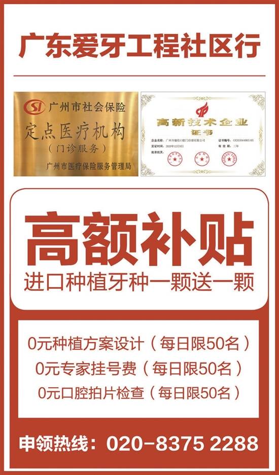 文/华章 缺牙不修复五大危害 随着生活水平的提高,人们越来越重视自己的牙齿,但依然有些人认为缺一两颗没关系或者人老了迟早要掉牙的。其实这种观念是大错特错,因为缺牙不修复有五大危害,比如肠胃受累、余牙移位、引发牙周病、发音不清、面容苍老……如果不想遭这些罪,建议缺牙得及时种植! 牙齿问题不注意,后果很严重 俗话说“活到九十九,全靠好牙口”,健康幸福的晚年需要一口好牙来支撑。德伦口腔的医生指出,如果刷牙时出血、牙龈红肿出血,这提示有了牙周炎,等到中期还会伴随有牙龈萎缩、出现口气加重的问题,晚期时有明显的牙齿松动、咬合无力、牙根暴露的问题,进而最终导致牙齿脱落。不仅如此,牙周炎和身体各机能密切相关,可谓是“祸及全身”。 一站式数字化种植,久用无忧 德伦口腔作为国内较早一批拥有一站式数字化种植技术的口腔机构,拥有全套数字化导板设计和经验丰富的专家团队、诊疗专家级别设计团队,全套数字化种植设计软件和数字化导板输出端口,种牙过程的所有环节均可在院内一站式完成,无需依赖第三方,导板使用率与输出量均为全国较高值。 限时福利,种植牙种一颗送一颗 为了能让市民解决缺牙问题,“2021广东爱牙工程社区行”1000颗进口种植体限时免费送,仅限本月,享博硕学位专家种植名医亲诊,免挂号费,专家会诊费,凡是有单颗牙缺失、多颗牙缺失、半口/全口牙缺失等市民均可致电020-8375 2288,即可申请优惠,名额有限,先到先得!
