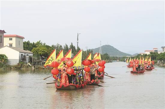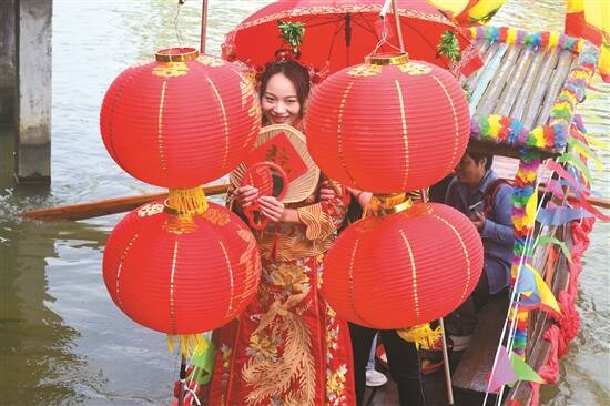 羊城晚报讯 记者朱嘉乐、文艺摄影报道:上花船、祭龙王、跨火盆、拜高堂……10月24日上午,由18对新人组成的珠海市斗门区第十届“斗门水上婚嫁”集体婚礼在美丽乡村南澳村举行。据了解,斗门区莲洲镇有望成为珠海市唯一上榜的“中国民间文化艺术之乡”。 在婚礼主仪式上,18位新娘首先在亲友的陪同下在游船码头齐上花船。伴随着大妗姐们悠扬的咸水歌声,新娘们在船上完成了三杯酒的“祭龙王”仪式。随后,花船出发前往迎亲码头。新娘们各自手持竹扇和一面红色镜子,身着红色嫁衣,在船头伫立。花船载着新娘们穿过幸福桥,陆续到达婚礼现场。而在迎亲码头,18位新郎已早早等候在场。在喜气洋洋的鞭炮声中,新郎接上新娘,一起完成跨火盆仪式,来到主婚场。在父母和主婚人的见证下,18对新人们完成了拜高堂仪式。 斗门是著名的侨乡,也是著名的水乡。2008年,“斗门水上婚嫁”被列入第二批国家级非遗保护名录,也是珠海市第一个国家级非遗项目。此外,文化和旅游部于近日公示2021年-2023年度“中国民间文化艺术之乡”拟命名名单,其中,斗门区莲洲镇凭借“水上婚嫁习俗”入围,有望成为珠海市唯一上榜的“中国民间文化艺术之乡”。据了解,“中国民间文化艺术之乡”自1987年开展创建以来,已经成为推动民间文化艺术事业繁荣发展、丰富活跃基层群众文化生活的重要公共文化品牌项目。 斗门水上婚嫁习俗便源于疍家人对歌成亲的礼仪,融汇了广府文化和客家文化的元素。它形成于清初,成熟于清代同治光绪年间,迄今已有400多年历史。这项习俗的婚嫁程序繁复多样,共有“夹年生”“拿茶叶”“择日”“使日”“起厨”“坐高堂”“上头”“嫁仪”“花船迎亲”“渡水饭”“拜堂”“闹洞房”“回门”13项。 经过几百年的沧桑变化和数代人的融合、沉淀,斗门水上婚嫁习俗极具地方风情,承载着斗门的记忆和疍家的乡愁,也是“粤港澳大湾区”文化同根同源、文化价值认同感不断增强的体现。