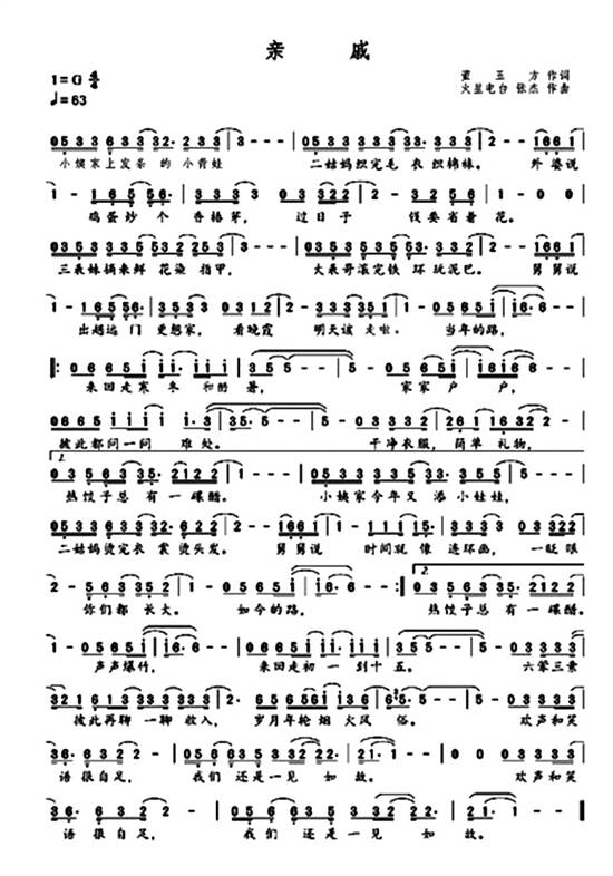 如果说歌词前半部分大体描写了亲戚的日常生活,后半部分则写了过年时走亲戚的一些画面,以及对岁月流逝的感慨。从“热饺子总有一碟醋”开始,画面切到了过年的场景。“声声爆竹,来回走初一到十五。六荤三素,彼此再聊一聊收入”两句,则写了放爆竹的年味气氛,六荤三素的过年大餐,亲戚间充满人情味的家长里短。“当年的路,来回走寒冬或酷暑”,道出了寒暑假是走亲戚的两个重要时间节点。“欢声笑语很知足,我们还是一见如故”,亲戚间难以割舍的情感,就在这“一见如故”里了。