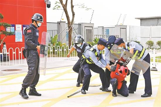 文/图 羊城晚报记者 郑达 通讯员 郭金海 赵灵华 近日,珠海高栏港公安分局平沙派出所与平沙镇汇华四季小学,联合开展了“最小应急单元”处置突发事件的应急演练,此次演练共有100余人参加。 最小应急单元是指由单位、场所、重点目标等安全防范责任单位现有保卫组织及力量组建的最小机动人员编组,每个编组(至少为2人,其中1人为单位保卫干部)称为一个最小应急处置单元。最小应急单元受属地派出所指导监督,服从派出所区域联动调度,协助公安机关先期处置正在发生的各类违法犯罪行为及其他危害公共安全的突发事件。 演练过程中,一名男子趁学校放学期间,手持刀具不顾值班保安的劝阻,企图强行闯入校园。正在值勤的警戒员发现后,迅速持配备的安全钢叉、防护盾牌进行拦截,并限制该男子的活动范围。随即在场的老师、家长和志愿者迅速保护学生撤回校园内,保安员迅速关闭校门后,在持应急装备前来增援的同时,启动校园一键式报警装置。几分钟后,平沙派出所民警赶到现场,成功将该男子抓获并带离现场。前后历时约10分钟,演练圆满结束。 本次演练对于公安机关推进校园治安防控“最小应急单元”建设工作,探索校园安全管理有着十分重大的意义,不仅让师生提升了对校园突发事件的应对能力,而且让“最小应急单元”成员大大巩固了应急处置技能,进一步强化了校园及周边治安防控能力和水平。 目前,高栏港警方已在金湾区平沙镇、南水镇组建成“最小应急单元”44个,应急处置力量150人,已全涵盖了两镇的所有学校。下一步,高栏港警方将通过“最小应急单元”建设以点带面逐步覆盖到辖区重点单位和人员密集场所,全力维护辖区社会治安大局稳定。