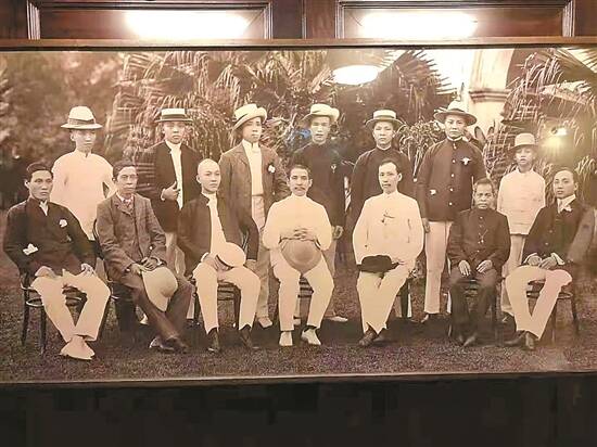 孙中山与其支持者及同盟会新加坡分会成员摄于晚晴园(1905年底),后排右三为邓子瑜 邓秋林 供图 |