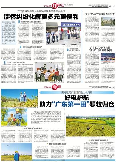 广东省台山市都斛镇拥有高产稳产的万亩水稻示范田,现有种植面积达万亩,被誉为“广东第一田”,也被农业农村部定为全国水稻万亩高产创建示范片。为不误农时,确保秋粮颗粒归仓,连日来,南方电网广东江门