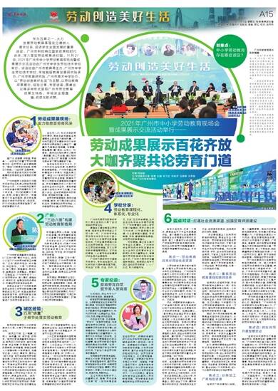 统筹/陈晓璇 文/羊城晚报记者 蒋隽 孙唯 实习生 符晓灵 冯婷婷 马秀岩 图由广州市教育局提供 作为五育之一,大力发展劳动教育是落实立德树人根本任务,促进学生全面发展的重要途径。广州市积极响应国家政策和时代诉求,深入落实劳动教育进校园。11月27日,2021年广州市中小学劳动教育现场会暨成果展示交流活动在广州市中学生劳动技术学校举行。该活动由广州市教育局主办,广州市中学生劳动技术学校、羊城晚报教育发展研究院承办,广州市教育研究院、广州市美术中学协办,以“劳动创造美好生活”为主题,以劳动教育成果展示、经验分享、专家讲座、圆桌会议等多种形式呈现广州市劳动教育成果及特色。羊城派全程直播,收获无数点赞。 劳动成果展现场:实力取胜显劳育风采 画广绘、做面膜、印版画、烹佳肴……会场专门设置了劳动成果展示区,各校劳动小能手摆摊展示,“摊主”们或是主动出击,或是实力取胜,“八仙过海”各显神通。 现场记者的目光被孩子们鲜艳精致的服装和生动有趣的成果吸引。 广州市回民小学四年级刘同学将在综合实践课上种出来的蔬菜送给大家。广州市越秀区朝天小学则凭借中草药面膜吸引了不少尝试者,“我们的面膜分为美白、祛斑、祛痘三种功效。”凭借毗邻广东省中医院、很多学生是医生子弟的天时地利人和优势,孩子们在医生阿姨的指导下,学到做面膜的方法。 在五花八门、形式多样的劳动成果中,美食总能另辟蹊径凭借嗅觉上的冲击力顺利吸睛。广州市花都区花东镇联安初级中学的同学们便在摊位上摆出了一罐罐热气腾腾的猪脚醋、鸡脚醋、鲫鱼醋等“醋”美食,让观众一啖美食。同学们还现场展示了制作“臭屁醋”的工艺流程,辅以现场解说,让观众对“臭屁醋”这种传统美食有了更加清晰的了解。 除传承发扬传统文化外,不少学校依托当地资源,发展劳动教育课程特色。广州市花都区狮岭镇冠华小学身处“中国皮具之都”,早在2007年学校就开设了皮雕相关的专业课程,根据年级层次分别教授皮革剪接和皮雕技能,并将皮雕制作纳入六年级学生的毕业设计内容中。麦老师曾在意大利和北京学习皮雕,之后回乡创业,业余时间回到母校教师弟、师妹制作皮雕、皮具。 在劳动教育课程中,同学们通过种植、制作、学习等多样化的实践活动,获得相应的劳动技能,从中感悟劳动价值,收获劳动快乐。 广州:“三动六策”构建劳动教育新格局 广州市教育局副局长陈敏生以“三动六策”模式为主线,向观众介绍了广州市劳动教育工作情况。“三动”即政府驱动、学术推动、市区联动,“六策”为顶层设计、育人模式、课程建设、师资队伍、品牌活动、资源整合。根据这一实施路径,广州市形成了“3+N”的顶层设计、育人模式、课程体系、师资队伍、品牌活动和资源体系,构建出劳动教育的新格局。 陈敏生总结了广州市教育局探索全市中小学劳动教育模式需要做的五项工作,包括全面贯彻党的教育方针,将劳动教育与其他四育放在同等重要地位,深入推进广州市劳动教育实践;进一步完善经费投入机制,加强场地保障;持续完善教育现代化背景下学生劳动教育的多元评价体系;广泛开展劳动教育主题活动,打造广州市劳动教育品牌;各学校严格按照劳动教育政策文件,形成综合性、实践性、开放性、针对性的学校劳动教育。 陈爽表示,根据“三动六策”主要实施路径,广州市劳动教育达到了预期的社会效果和育人目标:一是改革创新走在前列,二是一校一品形成品牌,三是实践活动内容丰富,四是各区各校特色鲜明。 陈爽提出,要提高政治站位,切实强化抓好劳动教育的责任感和使命感;准确把握育人导向,遵循劳动教育规律,因地制宜,综合施策,积极探索形成符合中央教育理念要求的劳动教育模式;形成广州劳动实践教育联盟和“大湾区中小学生综合素质教育基地”,打造大湾区劳动教育高地。 城区经验:巧用“锦囊”于细节处落实劳动教育 越秀区教育局和从化区教育局作为代表,分享了劳动教育的经验。 “越秀区巧用‘五个锦囊’实现从‘举质量’到‘减负担’的转变。”越秀区教育局副局长陈晓介绍,越秀区以行政驱动,通过统筹协调、专业支撑、协同推进,形成政策制度、教研管理、课程实施等七大保障体制;以教研推动,凭借定位准、人到位、事做好、搭平台“四大法宝”有效促进越秀劳动教育发展;以学校行动,积极开发和建设校内劳动实践场地作为“硬件”,聚焦学生劳动素养,创设和开发劳动实践课程作为“软件”,为劳动教育落实提供场地支持和课程保障;以劳动作业为抓手,科学设计,使其全域渗透,“减负”“提质”并行,促进学生全面发展;以学校劳动和家庭劳动的“两渠”和越秀区将综合实践活动基地生产劳动、区少年宫智造劳动、社会基地职业体验、社区志愿服务劳动地“四道”作为资源整合点,于细节处落实劳动教育。 从化区教育局副局长陆敬强介绍了从化区由农耕文化特色项目和其他特色项目组成的“1+N”模式。从化区出台《广州市从化区教育局关于加强中小学劳动教育的指导意见》,加强劳动教育课程建设与管理,将“农耕从化,知行合一”作为区域劳动教育特色,构建课程体系;加强师资队伍建设,努力打造专兼职结合的劳动教育师资队伍,目前已有1名专职劳动教育教研员、1162名专兼