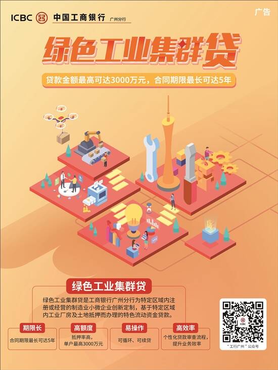 提升绿色金融发展质量,要用心助“绿”。工行广州分行创新推出多种类型“绿色金融产品”。针对绿色经济领域的各类型客户,该行创新推出了绿色工业集群贷、绿色营运资金贷款、绿色贸易融资、绿色债务融资工具等一系列“绿色金融产品”。值得一提的是,在支持制造业领域方面,创新推出“绿色工业集群贷”产品系列,专门为持有特定工业聚集区工业厂房的制造业小微企业提供融资支持,其中于去年率先推出的“花都绿色工业集群贷”,业务余额已超过3亿元。