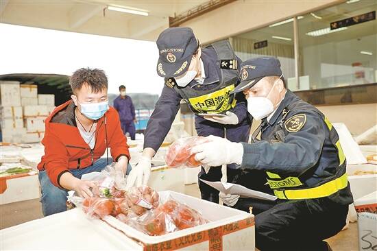 2017年12月1日,拱北口岸鲜活产品绿色通道提前1小时开启,关员验放鲜活产品 俞波 摄 |