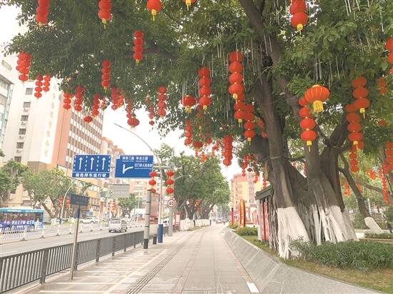 市区主干道两旁绿化树上挂满红灯笼 陈卓栋 摄 |