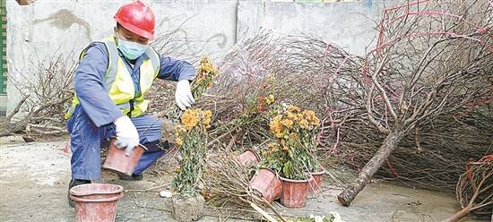 环卫工人对植株和花盆进行分离 |
