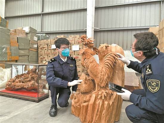 羊城晚报讯 记者宋王群、通讯员陈子铭摄影报道:2月11日,经鉴定,深圳海关所属蛇口海关此前在出口货运渠道查获的3尊伪瞒报木质工艺品及1件长方形状木材均属于濒危木材制品。目前,该案件已移交缉私部门处理。 日前,蛇口海关在对一批货运出口货物进行查验时发现,在集装箱里有3尊伪瞒报木质工艺品,分别为公鸡形木质工艺品30千克、牛形木质工艺品20千克和蝙蝠形木质工艺品20千克。经鉴定,上述3件均为翠柏木制工艺品。同时,还查获1条长方形状伪瞒报木材,重约500千克,经鉴定,属特氏古夷苏木。4件工艺品均为列入《濒危野生动植物种国际贸易公约》(2019版)附录Ⅱ的濒危野生植物制品。 海关提醒,根据《中华人民共和国濒危野生动植物进出口管理条例》,携带、邮寄或者运输濒危野生动植物制品出入境的,需提交《濒危物种允许进出口证明书》,并提前向海关申报,依法接受海关查验。