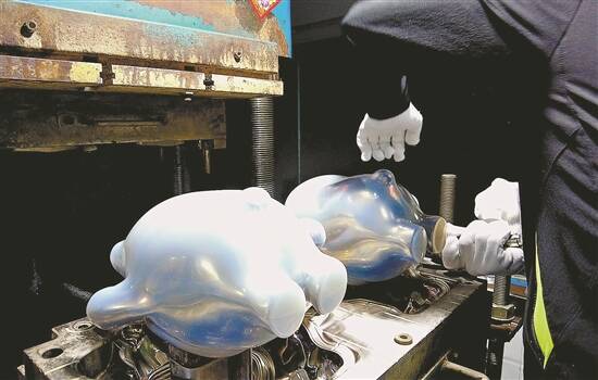 东莞某企业冰墩墩“外衣”生产车间,机器增压塑形后拉出进行脱模 |
