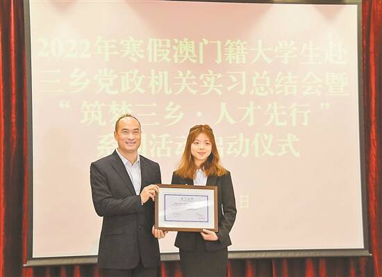 文/图 羊城晚报记者 林翎 通讯员 袁旺 祁诣曾 2月17日,中山市三乡镇举行2022年寒假澳门籍大学生赴三乡党政机关实习总结会暨“筑梦三乡·人才先行”启动仪式。澳门籍大学生赴三乡党政机关实习,是港澳大学生首次赴内地基层党政机关实习,是港澳青年爱国主义教育方式的持续创新。 五名澳门籍大学生收获颇丰 2022年寒假,澳门中联办北京联络部、中山市委组织部、中山市人力资源与社会保障局、中山市发展和改革局大湾区办公室、三乡镇党委政府等合作,组织“双一流”高校的澳门籍大学生赴三乡党政机关实习。 实习期间,三乡镇党委政府用心组织、悉心筹划、耐心培养,根据澳门籍大学生专业特点分配岗位,制定专门培养方案和管理办法,指定专人开展指导工作,让五名澳门籍大学生深入乡村基层、深入抗疫第一线,“沉浸式”体会党员干部全心全意为人民服务,“全方位”观察基层党政机关开展工作的方式方法,“零距离”感受人民群众和党、政府之间的“鱼水情”。 来自上海交通大学医学院陈子翘同学表示,他在实习期间成为一名疫情流调队员,每天要打几百个电话做流调溯源,“实习之后,我才知道原来我们的岁月静好背后有那么多基层工作人员的守护。”来自北京大学的潘凌子同学,在三乡镇综合治理办公室实习,她表示实习十分接地气,既增长了本领,又增长了见识,更加全面地认识了党、认识了国家,收获满满。 加强三乡与澳门人才交流合作 在会上,三乡镇党委副书记江骥介绍“筑梦三乡·人才先行”活动。据了解,三乡将建设中山国际人才港三乡服务中心、打造人才之家,以人才服务中心为主阵地,积极对接澳门、珠海等各方平台资源,融入到湾区人才“圈层”和“群体”。借助2022年中山人才节举办契机,三乡加强与澳门各方合作交流,举办人才节系列活动,构建高水平人才对外开放门户。 三乡镇党委书记郭明星向学生代表颁发了实习结业证书。他表示,三乡与澳门交流密切,很多澳门同胞在三乡创业居住,三乡将进一步落实中山市委人才工作部署,主动扛起“南联”发展主阵地职责,不仅继续开展澳门籍大学生赴三乡党政机关实习工作,更进一步加强三乡与澳门、珠海在人才、技术、文化交流合作,既主动服务澳门经济适度多元化发展,又促进三乡高质量发展,共建“珠中澳”优质生活圈。 澳门中联办北京联络部交流处处长司晨表示,寒假期间,组织五名澳门籍大学生赴三乡党政机关实习,是港澳大学生首次赴内地基层党政机关实习,也是港澳青年爱国主义教育的持续创新做法。组织港澳优秀青年到内地基层锻炼,不仅有利于促进大湾区城市人才交流融合,更有利于推进大湾区城市加速融合发展,助力培养港澳青年的爱国热情。 澳门中联办北京联络部将继续开展澳门大学生基层实践活动,培养熟知澳门和内地政策的人才,为澳门“一国两制”事业行稳致远贡献青春力量,为粤港澳大湾区融合发展提供持续动力。