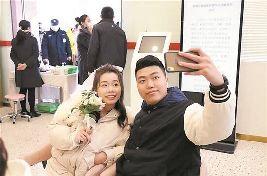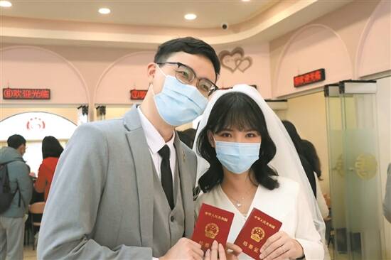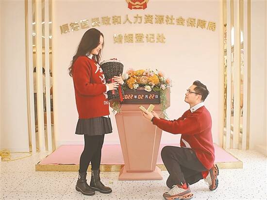 羊城晚报讯 记者欧阳志强、通讯员佛民政摄影报道:2022年2月22日,农历正月廿二日,星期二。不少佛山市民选择在这个“最有爱”的日子“拉埋天窗”,全市婚姻登记机关办理结婚登记957对。 在这特别的日子,冷空气也变得有点“甜”,当天结婚登记预约已经爆满。上午8时30分,在顺德区民政和人力资源社会保障局婚姻登记处,不少“准新人”裹着厚厚的外套有序排队,按照预约顺序分批次进入大厅进行结婚登记。天气虽冷,但是丝毫没有减弱洋溢在他们脸上的“幸福暖”。 等候区的沙发上,“准新人”们或相互依偎、或拍照留念;登记窗口前,一对对“准新人”在工作人员的指导下填写资料、核对信息,郑重地按下手印、签上名字后,便从情侣成功“晋升”为夫妻;出口处,一对对新人手捧着新鲜出炉的结婚证书,面露笑容…… 在人群中,穿着白色礼服、头戴白纱的关小姐格外抢眼。她与丈夫陈先生因工作而相识,陈先生追求她的那段时间,他们经常一起加班,“日久生情嘛,在圣诞节的时候,他向我求婚了,真的很惊喜。”关小姐笑着回忆他们的恋爱点滴。 为了让这天变得更有仪式感,关小姐四时多就起床化妆,“从南海区九江镇开车过来,八点多就到达啦”,由于之前他们提前到婚姻登记处审核相关资料,大大缩短了今天的办证时长。 “我们相识了六年,平时我在顺德,她在福建。今天终于结束了异地恋旅程,未来一起相伴至白首。”侯先生和他妻子握着手中新鲜“出炉”的结婚证,笑得十分甜蜜。 “今天,我们会采取增加婚姻登记员、增设办理窗口、延长服务时间等措施,加强2月22日婚姻登记服务保障,最大限度满足市民婚姻登记需求。”据市民政局相关工作人员介绍,2月22日当天全市各婚姻登记机关延长服务时间,增加婚姻登记预约数量,办理时间变更为上午8:30-13:00和下午14:00-18:30,所有服务窗口均用于办理婚姻登记业务,并向市民开放;同时,已在2月22日前为成功预约结婚登记业务的新人,做好资料预审工作,加快业务办理速度。此外,佛山各区提前调配好婚姻登记人员,聘请社工志愿者,增设窗口,增加预约数量,尽量确保当天来办证的群众都可以在这个充满爱意的日子里领到结婚证。