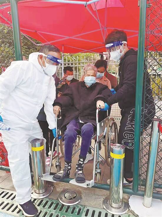 工作人员热心帮助身体不便的老年人参加核酸采样 |
