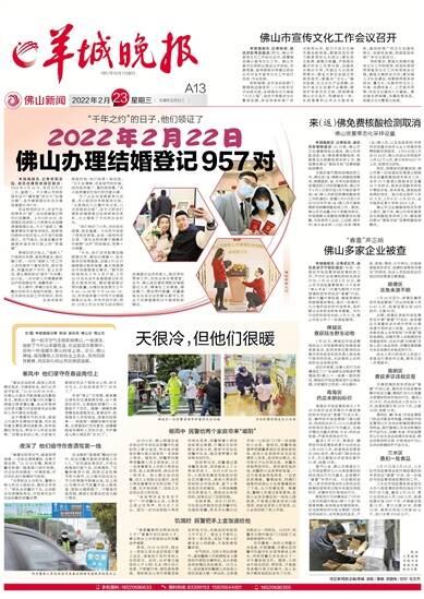 羊城晚报讯 记者欧阳志强、通讯员佛民政摄影报道:2022年2月22日,农历正月廿二日,星期二。不少佛山市民选择在这个“最有爱”的日子“拉埋天窗”,全市婚姻登记机关办理结婚登记957对。