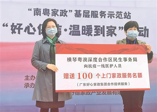 羊城晚报讯 记者钱瑜、实习生郑深月摄影报道:2月28日,横琴“南粤家政”基层服务示范站“好心保洁·温暖到家”活动启动仪式在珠海市人民医院横琴医院举行。该活动将为100位横琴医院在抗疫一线的医护人员免费提供基础保洁、电器清洗等服务,采取预约报名的方式进行服务排期,以配合医护人员的休息时间。活动持续2个月,每天可提供4个上门家政服务名额。 横琴粤澳深度合作区民生事务局代理局长黄宇杰表示,面对突如其来的新冠肺炎疫情,合作区的医护人员舍小家为大家,不分昼夜地奋战在抗疫一线,为琴澳居民的健康保驾护航。为感谢抗疫医护的辛勤付出,合作区民生事务局依托横琴“南粤家政”基层服务示范站,联合广东好心家政集团推出“好心保洁·温暖到家”活动,为抗疫医护人员家庭免费提供标准化、精细化家政服务,帮助医护人员解决家庭清洁的“后顾之忧”。今后,合作区民生事务局在加快民生配套设施“硬件”建设的同时,将着力提升民生服务“软件”水平,有效拓展澳门居民优质生活空间,推动琴澳民生深度融合,为合作区琴澳居民带来高品质生活体验。 据悉,横琴“南粤家政”基层服务示范站于2021年12月6日揭牌投入运营,分别于小横琴社区和横琴人力资源服务产业园设有服务站点,将围绕新时代合作区琴澳居民对优质家政服务迫切需求,为其提供社区居家护理、母婴护理、养老护理和医疗护理等“一站式”家政服务。