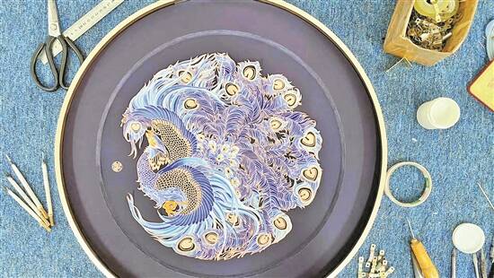 文/图 羊城晚报记者 梁正杰 近日,佛山市高明区举办高明城市价值与产业空间推介会期间,高明区区长姜岳新带领全域高质量发展观察团来到位于美的鹭湖森林度假区的高明非遗文化体验馆参观,实地体验高明创新打造“非遗进景区”的全域旅游新模式,介绍文旅融合成果。 威武的醒狮彩灯、朝天翱翔的“风筝龙”、精美的铜凿剪纸……步入佛山高明非遗文化体验馆,仿佛走入一个历史长廊,各种佛山文化瑰宝,宛如一幅精美的画卷,在观者眼前徐徐铺开。其中,现场进行的铜凿剪纸技艺展示让大家叹为观止,记者也就此带大家走近这一具有800多年历史技艺的前世今生。 迄今已有800多年历史 “啷……啷……”一阵阵敲击声,引起了嘉宾们的好奇心。原来在现场,佛山剪纸传承人茹新梅正进行铜凿剪纸技艺展示,引来众多嘉宾纷纷驻足观看、问询。 在现场,记者看到茹新梅以铜箔代纸,以凿代刻,用木槌轻轻敲打特制的小圆珠凿刀,在铜箔面上敲击出一点点的小圆珠,连接成图案线条,精美的铜凿剪纸形象便跃然纸上。 在人们的普遍认知中,剪纸一般都是用剪刀或刻刀等工具在纸片上或画、或剪、或刻。而佛山独有的剪纸,承载着岭南厚重的传统文化,迄今已有800多年历史,是最能代表广东民间艺术的瑰宝之一。 铜凿剪纸作为佛山剪纸中最具特色的一个品种,铜凿剪纸成了当地独有的技艺。由于铜箔来源稀缺,加之敲凿技术难度较大,铜凿剪纸曾经在佛山沉寂超过30年,后来得以恢复。恢复之后,制作工艺、手法基本保持传统韵味,但在工具和图案颜色上都有所创新。 茹新梅作为国家级非物质文化遗产佛山剪纸项目市级传承人,一直在佛山民间艺术研究社工作,从事佛山剪纸20多年,师从佛山剪纸省级代表性传承人何燕。她用了一年左右的时间去学习、熟习铜凿剪纸的工艺制作,一年后创作的第一幅铜凿剪纸《欢乐圣诞》,参加广佛肇三地工艺美术作品展便获得“铜奖”。 改良工艺适应市场需求 由于变化单一、设计守旧,无法紧随时代进步,广东不少民间艺术品制作日渐式微,再加上制作时间长,也令成本居高不下。铜箔剪纸如何抓紧机遇焕发新机? 据报道,南宋末年铜箔出现在佛山,经过较长时间的发酵,佛山铜凿剪纸的技艺最终在明代形成。 “它最初是民间用来祈福的装饰,原来是不镂空的,后来才和剪纸联系在一起。”茹新梅通过部分工具的改良和图案的镂空,来进行工艺上的创新,经过多年的钻研,线条流畅、自然清新的风格成为个人的剪纸特色。 “作为佛山独有的剪纸工艺,可以将很多表现手法与工艺融合于一体。”茹新梅对记者说,只要设计得当,就能成为现代人喜爱的文创产品。 据介绍,佛山铜凿剪纸以潮流姿态入驻市场,茹新梅的工作团队与佛山一家针对年青群体的服装企业合作,创作出一系列富有青春活力的铜凿剪纸,受到大众的喜爱。 在佛山市民间艺术研究社的展厅,记者看到扬尾欲游的斗鱼、花间窥视的豹子、清新脱俗青花瓷……众多斑斓艳丽的剪纸作品闪烁着独特的铜箔光泽,很有视觉冲击力。 “一开始是绘画, 把心中想呈现的图案设计出来。”茹新梅讲述了作品制作流程,“通过电脑绘图呈现画面,再把图稿交给剪纸师傅,用凿刀在铜片上敲打成不同的线条、肌理,然后把它刻出来,变成没有底色的铜凿剪纸,最后进行上色。” 茹新梅表示,铜凿剪纸的工具都要自己手工打磨,一把小如牙签的凿刀磨好要半天,而且每个人根据自己偏好制作,表面近似,各有侧重,故每套工具都是独一无二,也只有自己才用得就手。 现今图案设计其实和传统铜凿剪纸有不少区别,茹新梅说:“原来作品有很多繁琐的元素,如今风格则较为简约,更为纯粹,表现手法更现代点,更符合现代审美的要求。原来的装裱比较杂乱,现在把它变成纯黑框,可以最大限度地展现作品颜色和纹理。” 对传统作品的再改造也有了新思路,比如“宝瓶”系列。茹新梅介绍,“青花瓷韵”系列就是在原有作品的基础上,从颜色到装裱重新调配了一下,使风格更清淡素雅一些。 “因为铜凿剪纸的受众年龄层偏高,要走潮流路线得更新思维去做。让更多年轻人认识这门艺术。” 茹新梅提出,铜凿剪纸工艺融入HEA潮牌的设计当中,在狮头IP的基础上不断变化,就是一种新锐的尝试,但是万变不离其宗,“现在还在探索的过程中,未来可能会有更多脑洞大开的作品。” 从目前市场销情来看,记者发现,铜凿剪纸受众年龄层都往往已处中年,对于年轻人的吸引力仍有待提高。“通过进入中小学校园兴趣班、现场展示技艺等形式,来激发青少年的兴趣,活化非遗工艺,近年取得一定的成效。”茹新梅告诉记者,让更多年轻人去传承推广这门工艺才有希望。